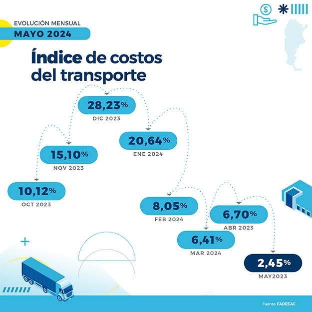 El Índice de Costos de Transporte (ICT) que elabora la Federación Argentina de Entidades Empresarias del Autotransporte de Cargas (FADEEAC) y audita la Facultad de Ciencias Económicas de la Universidad de Buenos Aires (UBA) muestra que en el quinto mes de 2024, mover un camión en la Argentina fue 2,45 % más caro.