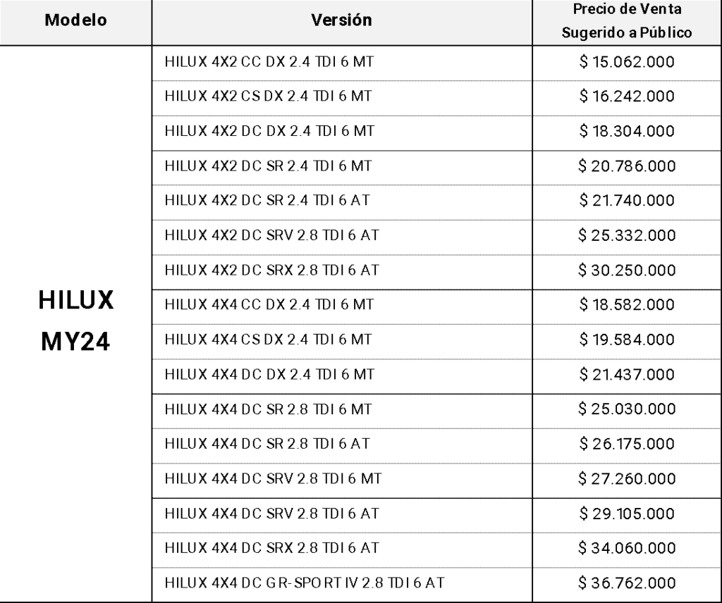 A continuación, se detalla el listado completo de precios de Hilux MY24 vigentes a noviembre de 2023: